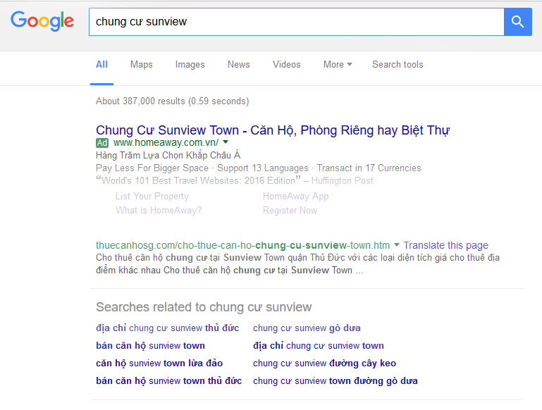 Tôi lấy ví dụ: Tìm từ khóa "chung cư sunview" : bạn sẽ được Google gợi ý một mớ như : địa chỉ chung cư sunview thủ đức, bán căn hộ sunview town, bán căn hộ sunview town thủ đức, chung cư sunview gò dưa ... lúc này nếu dự án của bạn thuộc khu vực nào bạn có thể lập kế hoạch từ khóa SEO cho trang web của bạn.