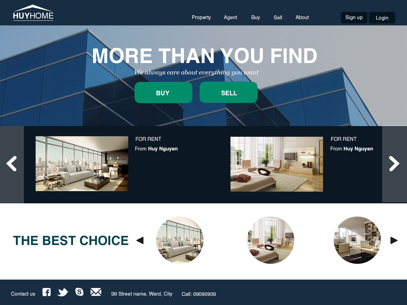 Tuy đã giới thiệu sản phẩm ở phía trên nhưng bạn nên đưa ra những đề nghị sản phẩm thích hợp cho khách hàng. Cách này sẽ sẽ giúp cho bản lập web bất động sản của bạn tương tác tốt với người xem và tăng hiệu quả bán hàng.Bạn dùng Type Tool (T) thêm Text “ THE BEST CHOICE” (Font Helvetica, Bold, 50 pt). Khởi động Ellipse Tool (U), giữ phím Shift để vẽ 3 hình tròn.