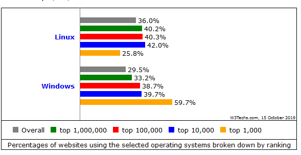 Ngày nay số lượng máy chủ linux đã nhiều hơn window dành cho các trang web. Một báo cáo cho thấy số liệu thống kê sử dụng của Linux nhiều hơn so với Windows là hệ điều hành trên web là 36% so với 29% window (Thời điểm bài được viết) (Nguồn: https://w3techs.com/technologies/comparison/os-linux,os-windows ) trong đó những trang web quan trọng trong top 1.000.000 lên đến 40.2 so với 33.2% của window.