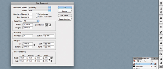 Đầu tiên là tạo mới một bản thiết kế trong InDesign. Sau đó tạo giấy tiêu đề (letterhead). Bạn tạo một văn bản kích cỡ A4 và bỏ chọn ô Facing Pages. Tạo lề với thông số: lề trên 30mm, lề trái 15mm, lề dưới 20mmm và lề phải là 20mm. Thiết lập ô lưới với 7 cột, gutter 3mm và bleed thêm 3mm trên tất cả các cạnh (nhấn More Options)