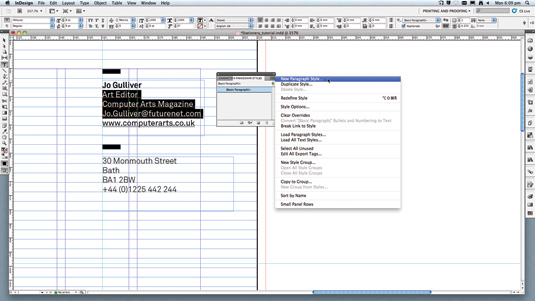 Hiệu quả của việc thiết lập bộ mã màu swatch và các sheet ở các bước đầu tiên được thể hiện khi ta làm đến bước này. Để tạo thay đổi cho các yếu tố, điều chỉnh và chọn Redefine Style ở bảng menu Paragraph Style. Để cho thêm các điểm màu, bạn cần chỉnh lại mã màu swatch của logo tại bảng Swatches. Cuối cùng, ta chỉ cần xuất tất cả sang file PDF.