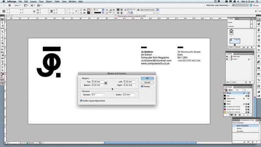 Tiếp theo, bạn cần điều chỉnh các lề của trang mới để thao tác trong các diện tích nhỏ hơn. Chúng ta thêm 10mm vào tất cả các cạnh bằng cách sử dụng hộp thoại ở phần Layout>Margins and Columns. Điều chỉnh phần bố cục và vị trí các yếu tố để tạo ra bố cục chung của tờ bướm ở mục #06.