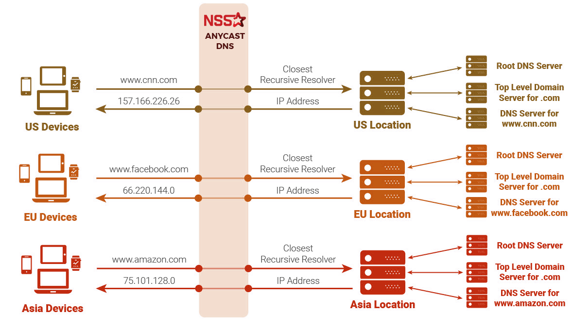 Khi khách hàng của bạn tìm kiếm một địa chỉ IP tương ứng cho tên miền của bạn, trình duyệt sẽ truy vấn DNS. Tất cả các máy chủ DNS đều có câu trả lời giống hệt nhau. Với anycast, hệ thống sẽ sử dụng khả năng định tuyến internet để làm mọi thứ nhanh hơn.