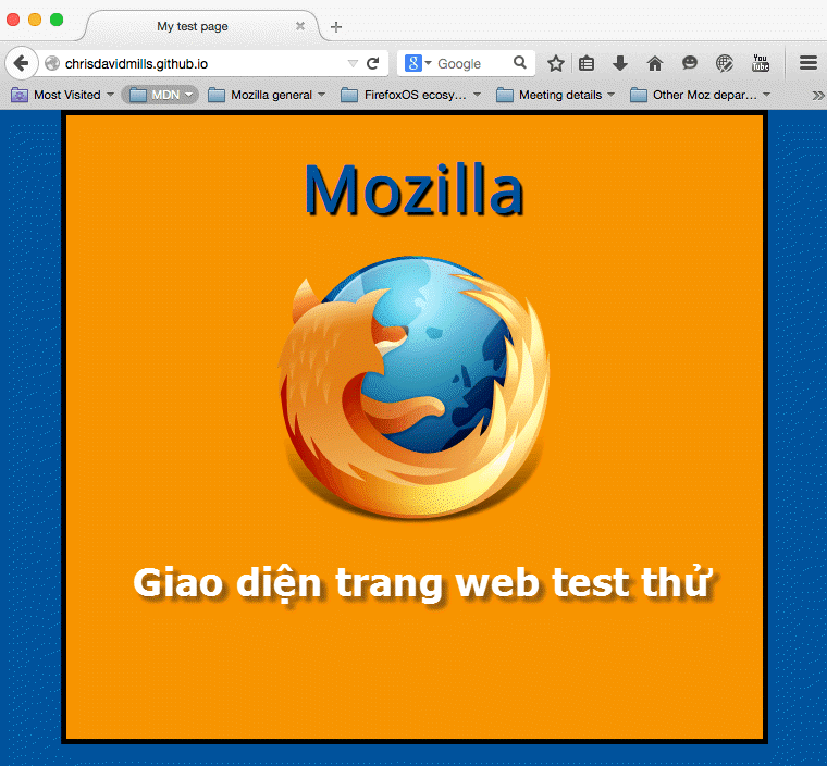 test-site của bạn (hay bất cứ cái tên nào khác mà bạn thích cho thư mục chứa trang web của bạn). Để làm điều này, sử dụng lệnh cd (i.e. "change directory"). Đây là những gì bạn sẽ phả gõ nếu bạn đặt trang web của mình trong một thư mục gọi test-site:cd Desktop/test-site 2. Khi đã xong việc trên, gõ tiếp những dòng sau, chúng sẽ yêu cầu git biến thư mục này thành một git repo:git init 3. Tiếp theo, quay trở lại trang GitHub. Trên trang đó hãy chú ý tới tùy chọn …or push an existing repository f-rom the command line. Bạn sẽ thấy hai dòng lệnh ở trong đó. Copy dòng thứ nhất, dán nó vào cửa sổ dòng lệnh và nhấn Enter. Dòng lệnh đó nên trông tương tự như thế này:git remote add origin https://github.com/bobsmith/bobsmith.github.io.git 4. Tiếp theo gõ 2 dòng lệnh này vào, và nhớ nhấn Enter sau mỗi dòng. Đây là đễ chuẩn bị cho việc tải file lên GitHub, và yêu cầu Git quản lý nhũng file đó.git add --allgit commit -m 'adding my files to my repository' 5. Cuối cùng, đẩy mã nguồn lên GitHub bằng cách truy cập GitHub hồi nãy và nhập vào terminal dòn lệnh thứ 2 bạn đã thấy trong Buớc 3:git push -u origin master 6. Bây giờ khi bạn truy cập vào trang GitHub của mình trong trình duyệt (username.github.io), bạn nên nhìn thấy trang web của mình trực tuyến! Hãy chia sẽ chúng với bạn bè của mình nào! Ghi chú: Nếu bạn mắc kẹt, trang chủ của GitHub Pages có thể sẽ giúp bạn giải quyết rắc rối.
