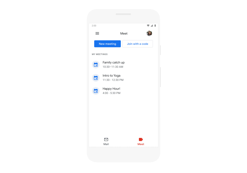 Ngoài ra, một tab mới có tên là Meet mới trên ứng dụng Gmail của điện thoại, nơi bạn có thể xem các cuộc họp sắp tới được lên lịch trong Google Calendar và dễ dàng tham gia cuộc họp chỉ bằng một lần click chuột.