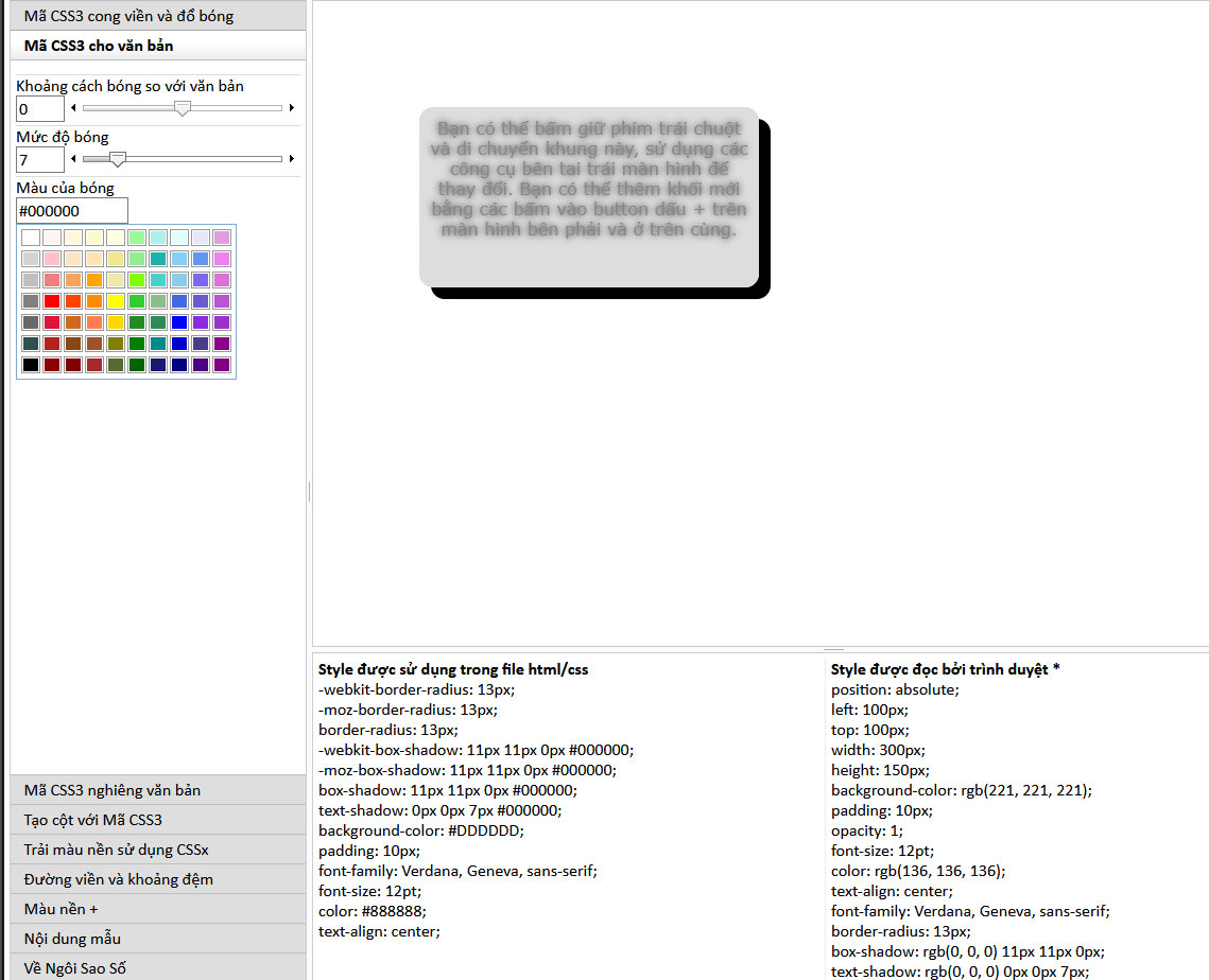 Nó không chỉ dừng lại ở việc tạo các đoạn mã CSS3 đơn giản, nó còn giúp nhà thiết kế và phát triển trang web thực hiện các đoạn mã CSS trực quan ngay lập tức hiển thị trên màn hình như làm cong viền, đổ bóng, nghiêng văn bản, tạo cột cho nội dung, trải màu nền, đường viền và khoảng đệm ... và nhiều tính năng thú vị khác đang chờ bạn khám phá.