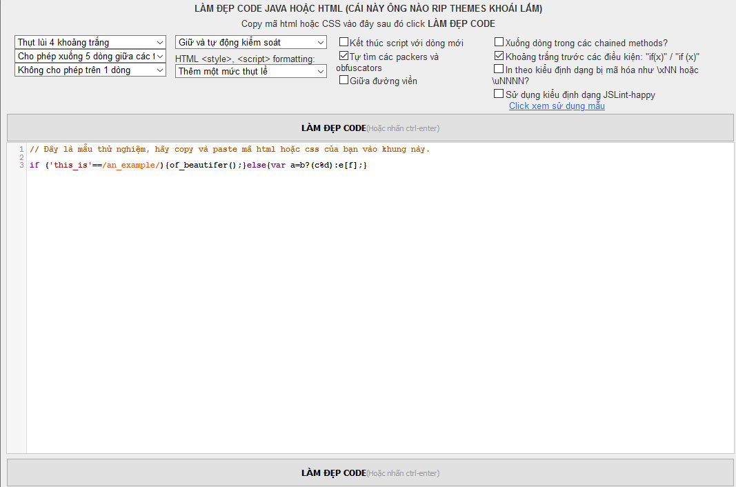 Cách thức hoạt động cũng khá đơn giản, chỉ cần copy mã html, css hoặc javascript vào ô công cụ sau đó bấm LÀM ĐẸP CODE là xong.