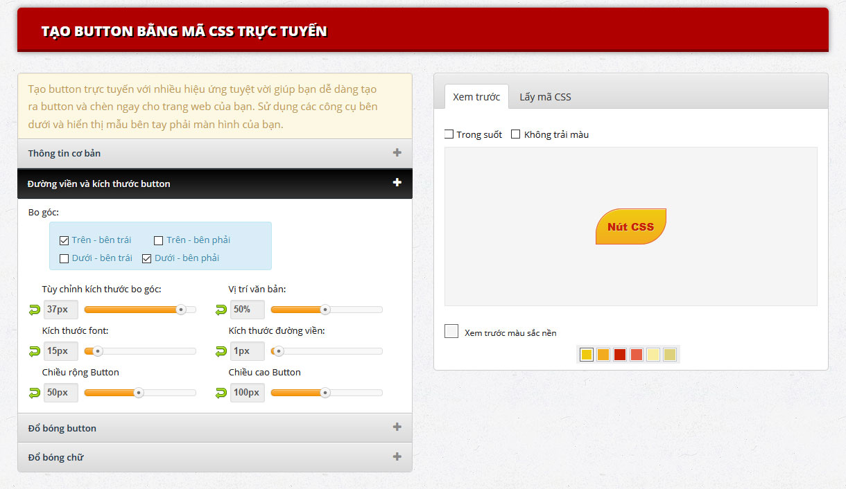 Nó có khá nhiều tùy chọn giúp bạn tạo nên một nút button đẹp cho trang web ngay lập tức và trực quan. Bạn chỉ cần vài thao tác đơn giản là có thể tạo ra button như ý.
